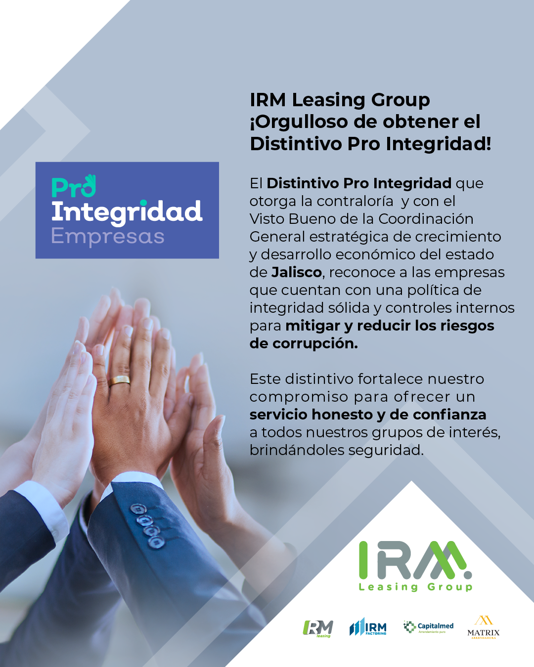 En IRM Leasing Group, consideramos que la integridad no es solo un valor, sino la base de todas nuestras decisiones y acciones. Estamos comprometidos en mantener los estándares éticos más altos en nuestras relaciones con clientes, colaboradores, accionistas, socios comerciales y proveedores; así como aplicar las mejores prácticas en materia de transparencia y cumplimiento normativo, garantizando que operamos con responsabilidad y respeto hacia la comunidad y el entorno en el que trabajamos.